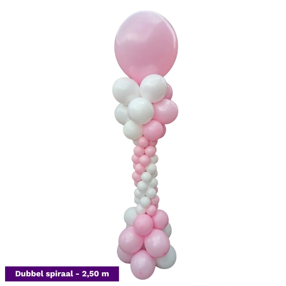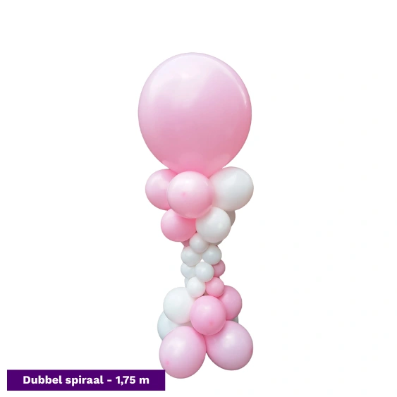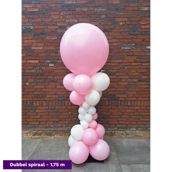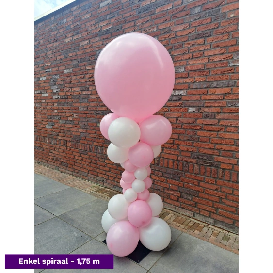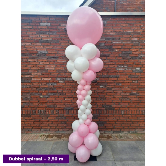 De spiraalvormige ballonpilaar is niet alleen prachtig opgebouwd, maar wordt ook bekroond met een grote topballon. Dat zorgt voor extra hoogte, een professionele uitstraling en een indrukwekkend geheel bij elke entree of feestlocatie.